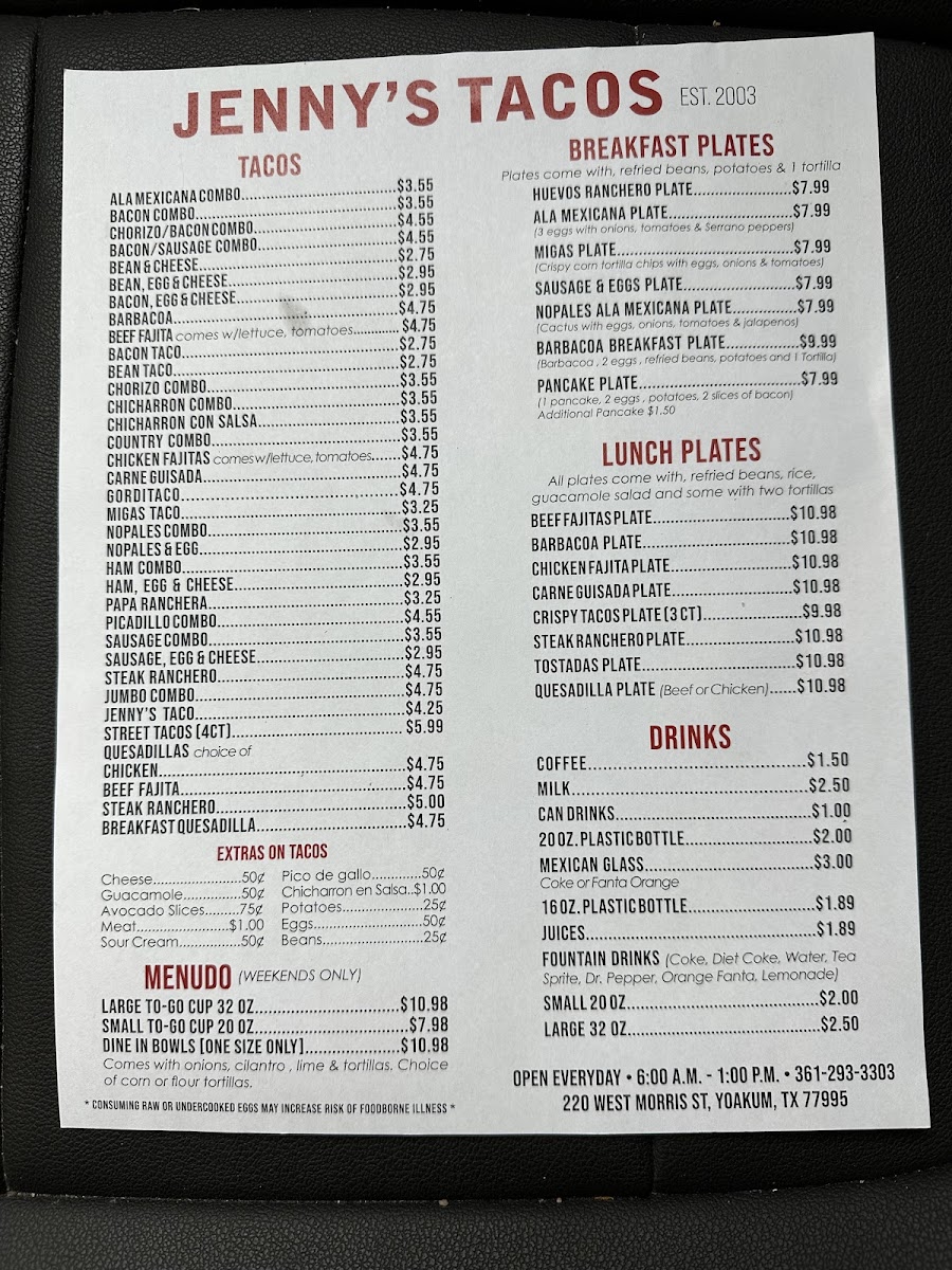 Welcome to Jenny's Taco, a delightful gem in Yoakum, Texas, known for its mouthwatering breakfast tacos and warm, inviting atmosphere. Located at 220 W Morris St, this locally-owned eatery has quickly become a favorite among residents and visitors alike.